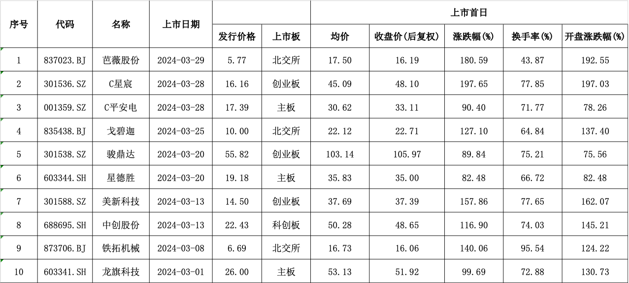 从上市首日表现来看,上述新股均未出现破发,其中涨幅包括超过100%的合计6只,其中其中C星宸(301536.SZ)涨幅最高。