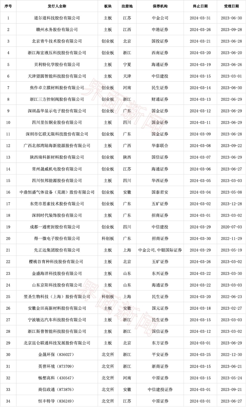 2024年1-2月IPO终止合计54家。经界面新闻记者统计,今年3月,沪深北交易所共计34个IPO项目终止。因此,前三个月合计达到87家。