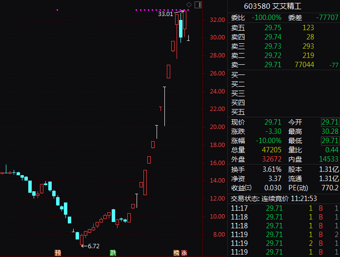 15日14涨停的艾艾精工终于停下了脚步,今日开盘跌停。狂飙期间,艾艾精工连续发布20条股价异动及风险提示公告。