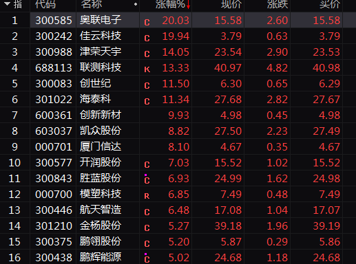 奥联电子高开后直线拉升20%涨停,开盘仅10多分钟成交就超过昨日全天成交;创新新材连续第2日涨停,联测科技、津荣天宇等涨停或涨超10%。