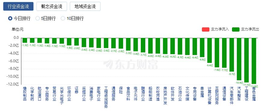 净流出方面,有色金属、工程建设、汽车整车等净流出排名靠前,其中有色金属净流出11.85亿元。