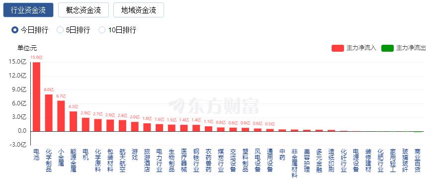 行业资金方面,截至收盘,电池、化学制品、小金属等净流入排名靠前,其中电池净流入14.97亿。