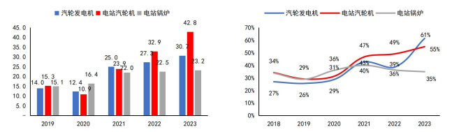 2019年—2023年公司汽轮发电机电站、汽轮机、电站锅炉销量及市占率情况如下: