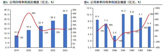 东方电气作为火电设备龙头,公司业绩受到行业高景气影响,自2019年至2023年净利润呈现稳定增长,4年年均复合增速29%,公司业绩保持稳定高增长。