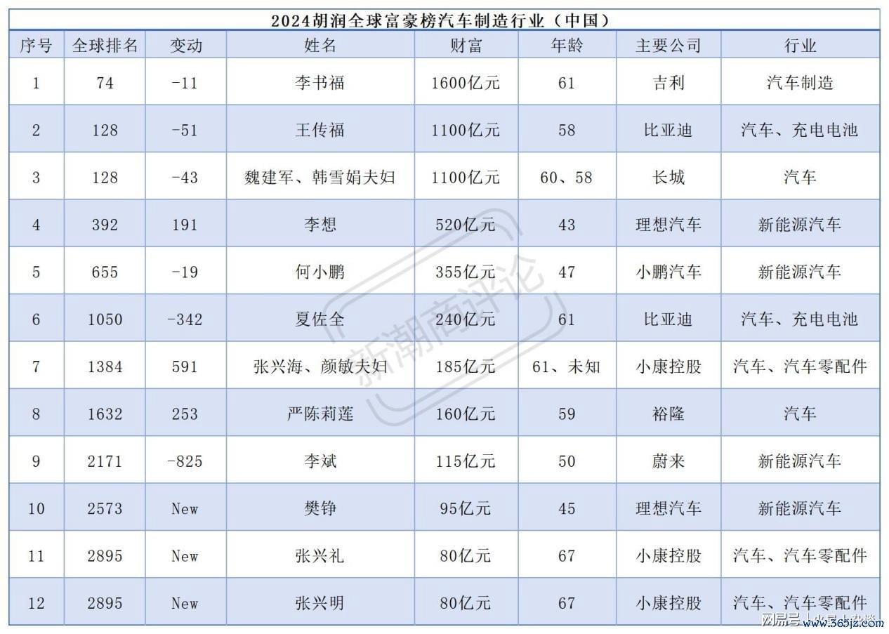 根据2024胡润全球富豪榜显示,61岁的李书福以1600亿元身家蝉联中国汽车行业首富,领先的王传福、长城汽车的魏建军、韩雪娟夫妇,同时跻身中国十大富豪之列,较去年上升2个名次。