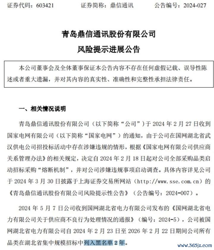 5月8日晚间,鼎信通讯公告称,国网湖北省电力有限公司(简称“国网湖北公司”)自2024年2月23日至2026年2月22日, 将公司所有品类在湖北省集中规模招标中列入黑名单2年。