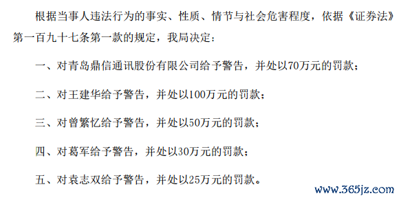 对此,青岛证监局根据当事人违法行为的事实、性质、情节与社会危害程度,依据《证券法》第一百九十七条第一款规定,决定对鼎信通讯及王建华等人给予警告,并处以相应罚款。