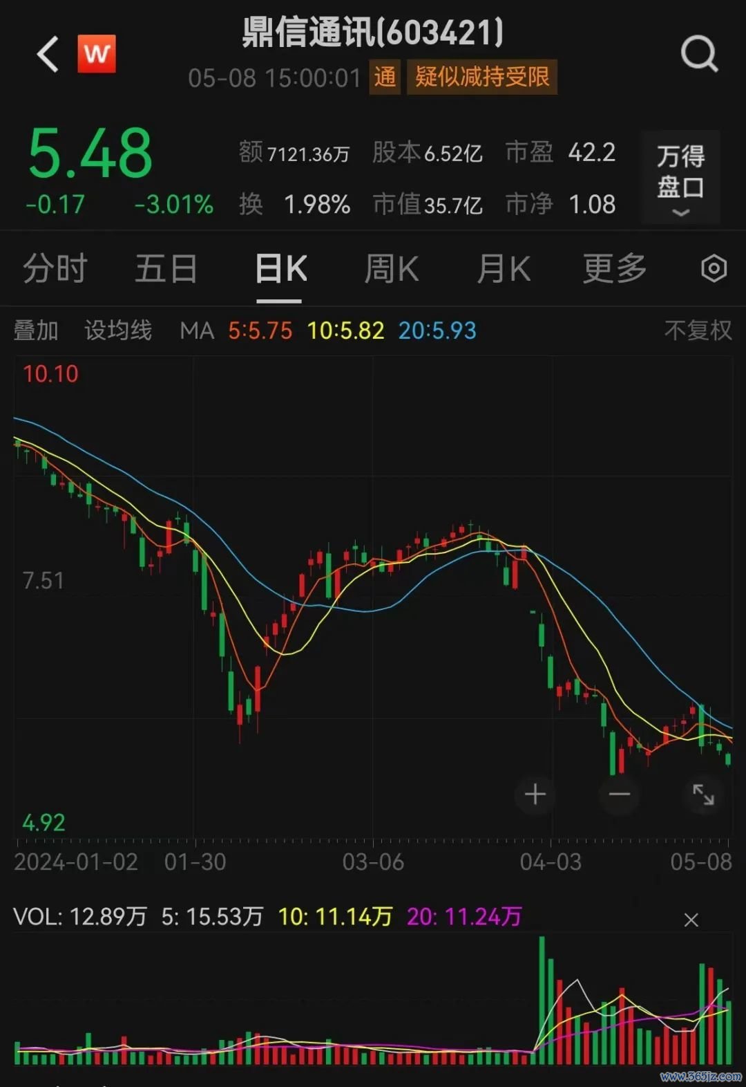 截至5月8日,鼎信通讯股价报5.48元,市值为35.7亿元。