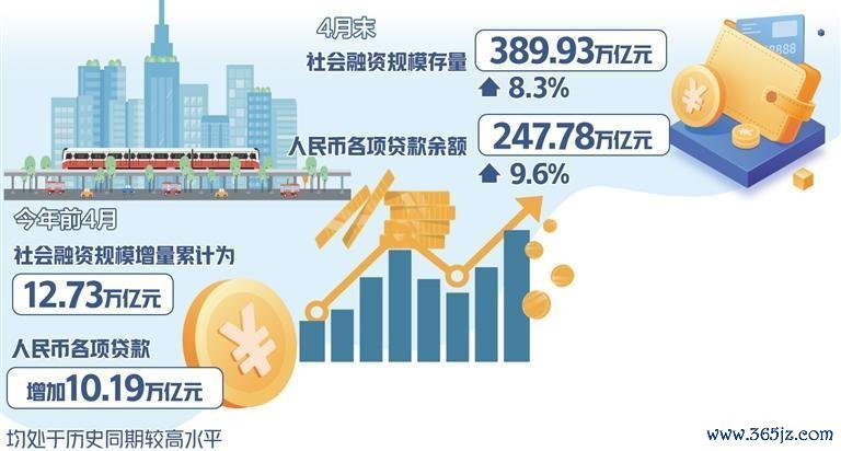 数据显示,4月末,社会融资规模存量389.93万亿元,同比增长8.3%,同经济增长和价格水平预期目标基本匹配;人民币各项贷款余额247.78万亿元,同比增长9.6%,增速与上月末持平。